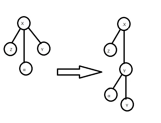 这一步相当于是让 Rake 操作加入某个 中点的操作直接发生在 Compress Tree 中,这不仅使我们能 正确维护 Rake Node 的信息(只需将三个儿子信息合并即可),还使我们 Compress Tree 的结构更完整。下一步,我们将 Compress Tree 改为三叉树,若某个 Rake Tree 的公共端点是 点 ,我们就将 Rake Tree 挂在 的中儿子处,如图。