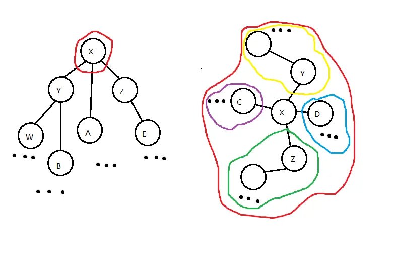 此时经过三叉化的 点,它的意义就变成先将其中儿子 Rake 到簇路径上,再统计左右儿子 和点 的信息。