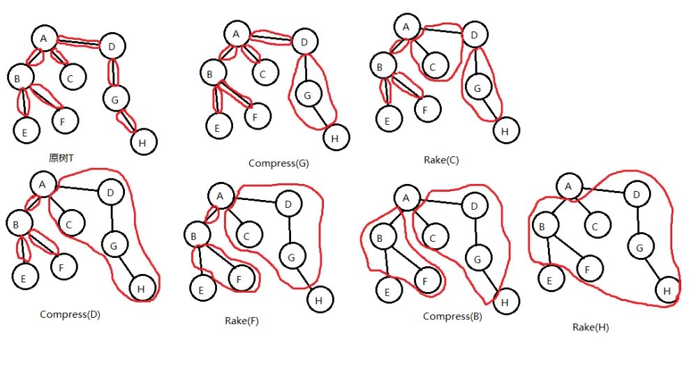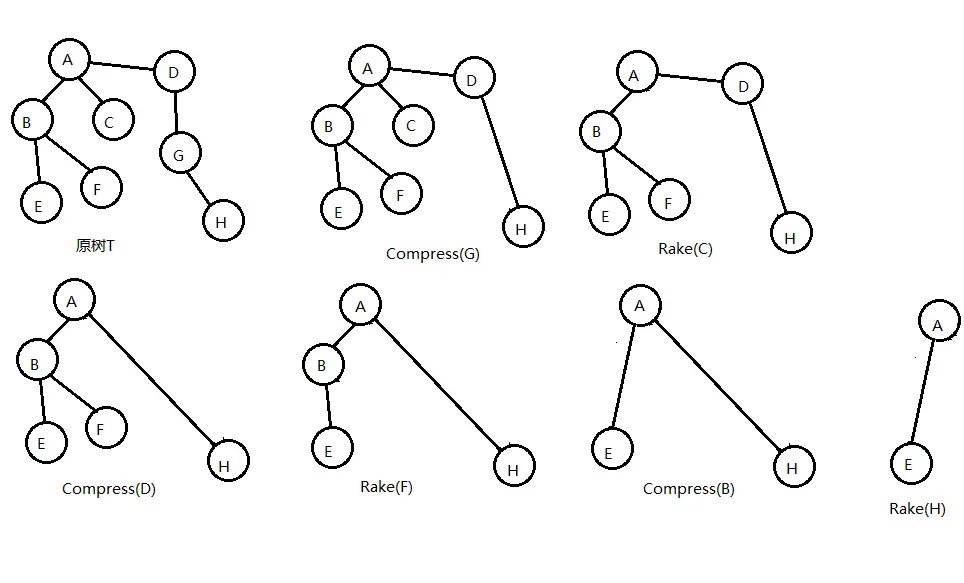 不难证明,任何一棵树都可以只用 Compress 操作 和 Rake 操作来将它收缩为一条边,如图所示。