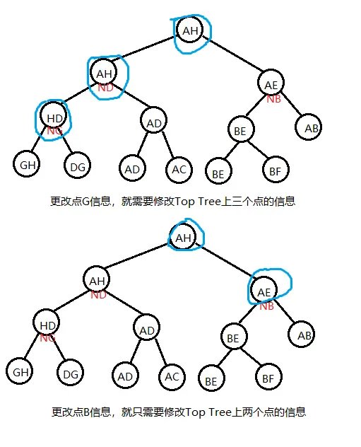 现在我们在维护时要对 中某个点 的权值进行修改,很明显,我们就需要更改 Top Tree 中所有簇信息包含 的节点信息,这样做单次时间复杂度会是 级别的。