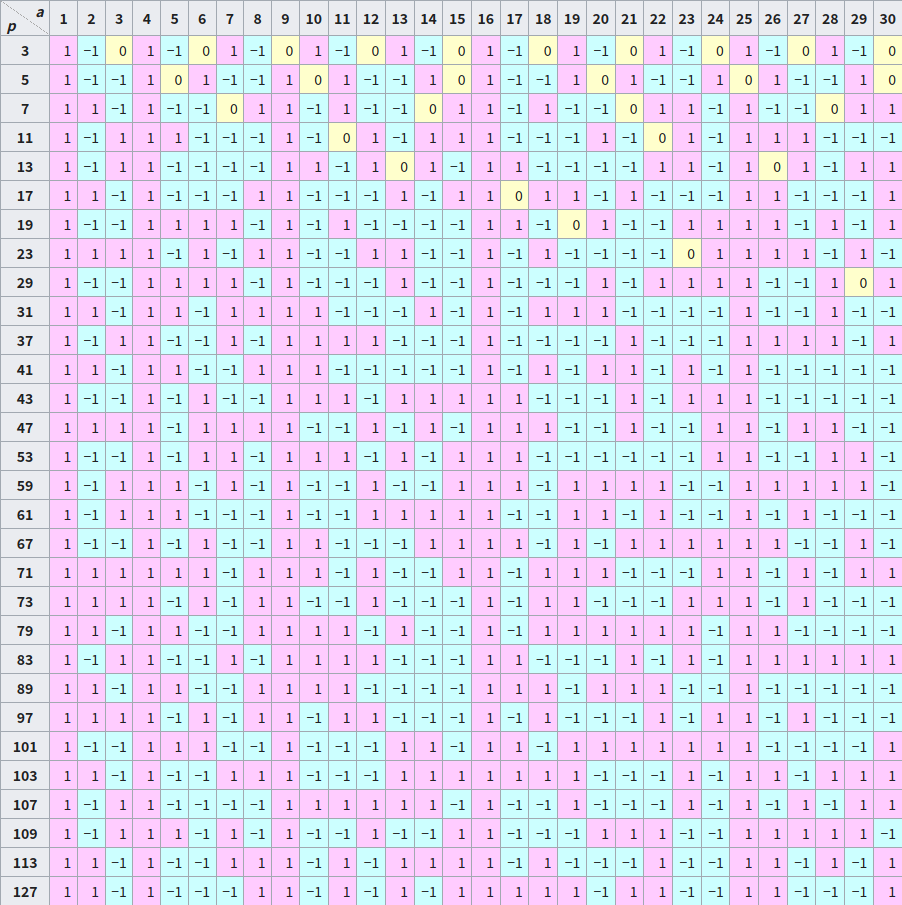 下表为部分 Legendre 符号的值(From Wikipedia)