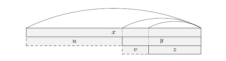 因为 是 的 border,所以 是 的前缀,设字符串 ,满足 (如下图所示),其中 是 的 border。考虑反证法,假设 ,那么 ,所以由引理 , 是回文串,由引理 , 是 的 border,又因为 ,所以 ,矛盾。所以 。