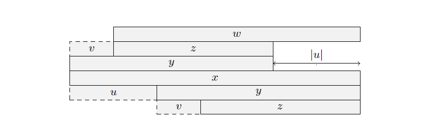 由引理 的推论, 是 的最小周期, 是 的最小周期。考虑反证法,假设 ,因为 是 的后缀,所以 既是 的周期,也是 的周期,而 是 的最小周期,矛盾。所以 。
