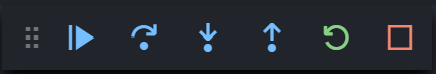 按下F5进入调试模式,编辑器上方会出现一个调试工具栏,四个蓝色按钮从左至右分别代表 GDB 中的 continue